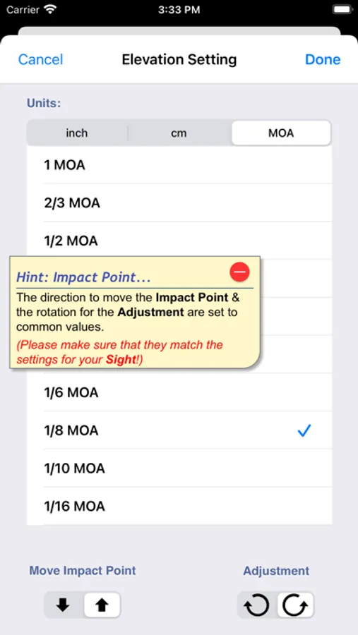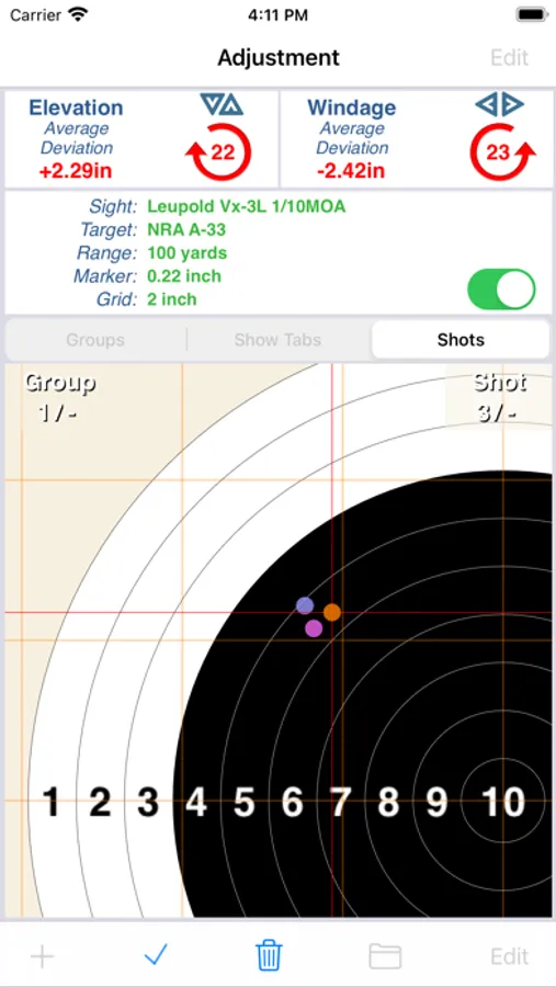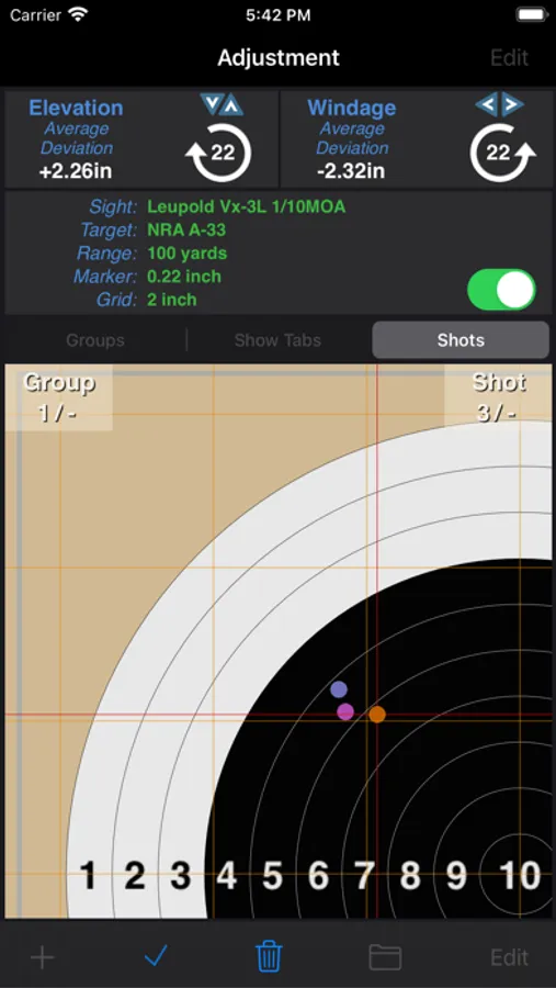 SightSet calculates average distance of your shots from the target center (in cm, inches or MOA), tells you how many clicks you need to make to adjust for windage and elevation, and even reminds you which direction you should turn the adjusters. If a couple of your shots have gone wild, simply go into edit mode to delete them so they don’t affect the calculations. You can even overlay a grid onto the target to get an easy indication of the spread of your shots.
