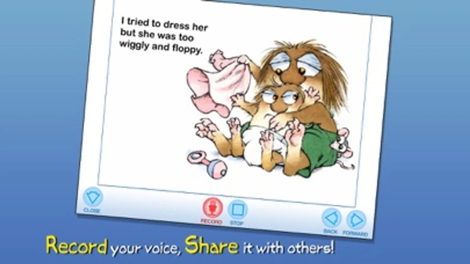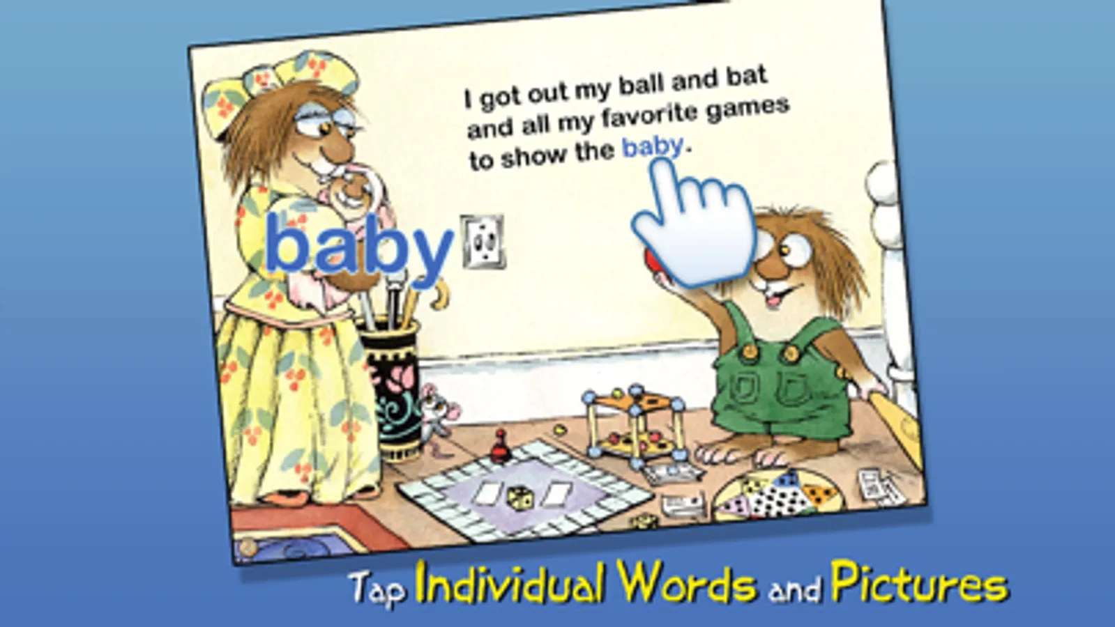 Dive into 10 exciting Little Critter interactive book apps that lovingly address all the major issues of growing up! Explore pictures, learn new vocabulary, and personalize each story with your own narration. Children will easily identify with Little Critter's adventures as he maneuvers through childhood one day at a time.