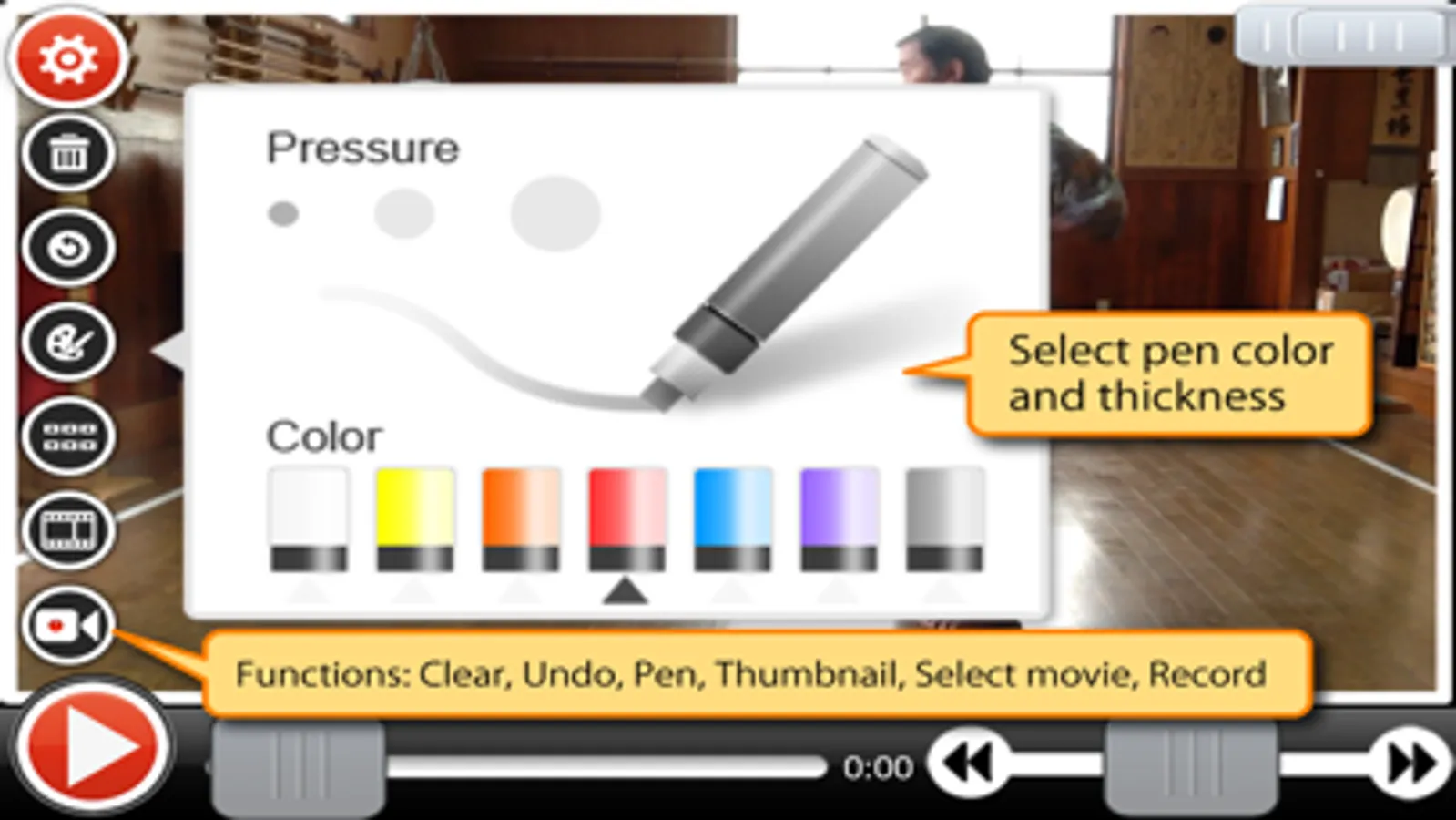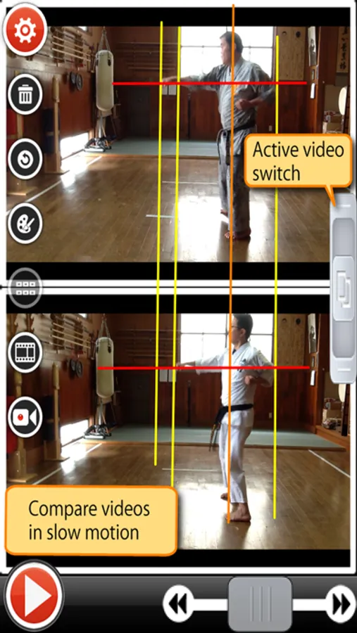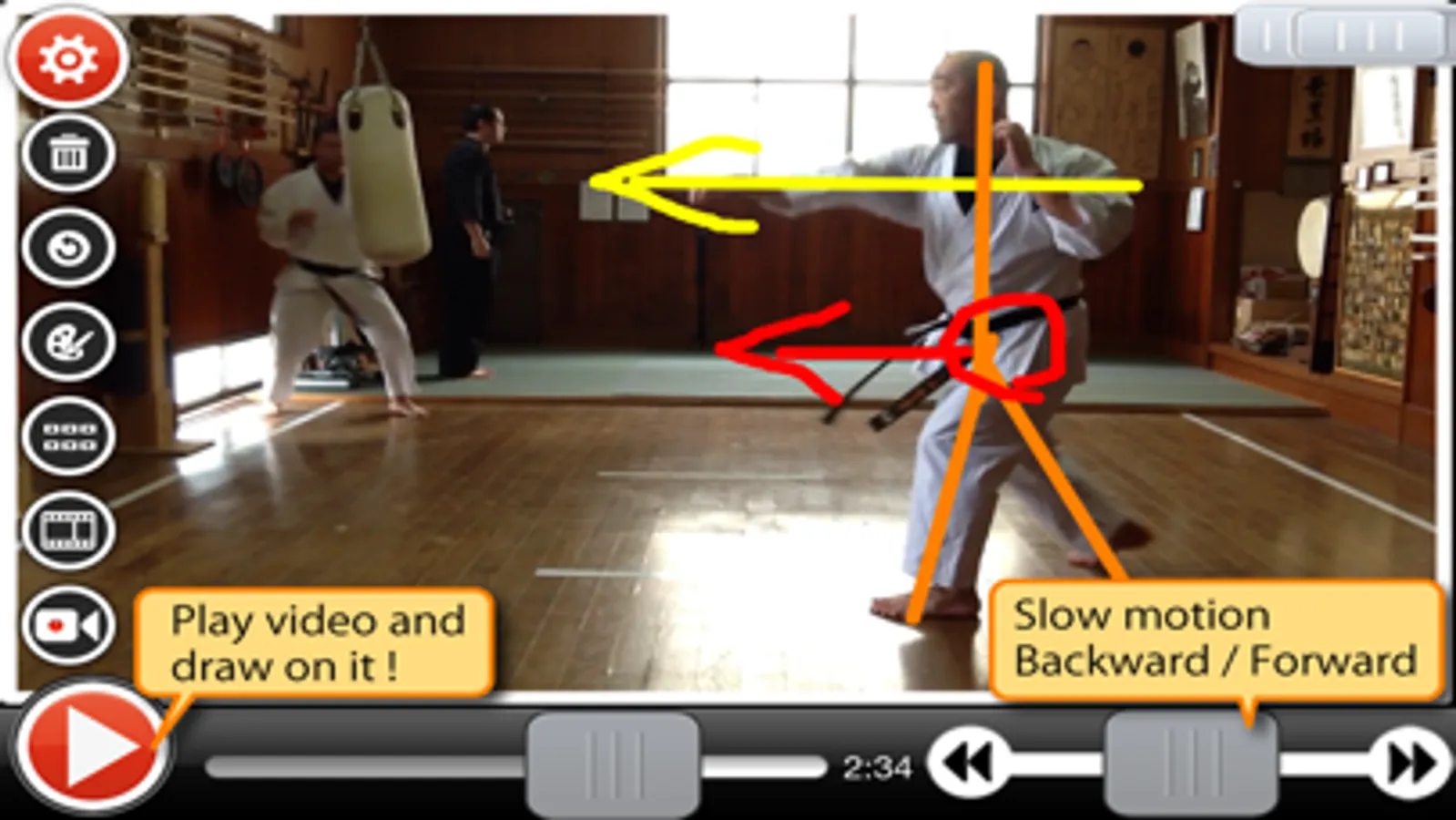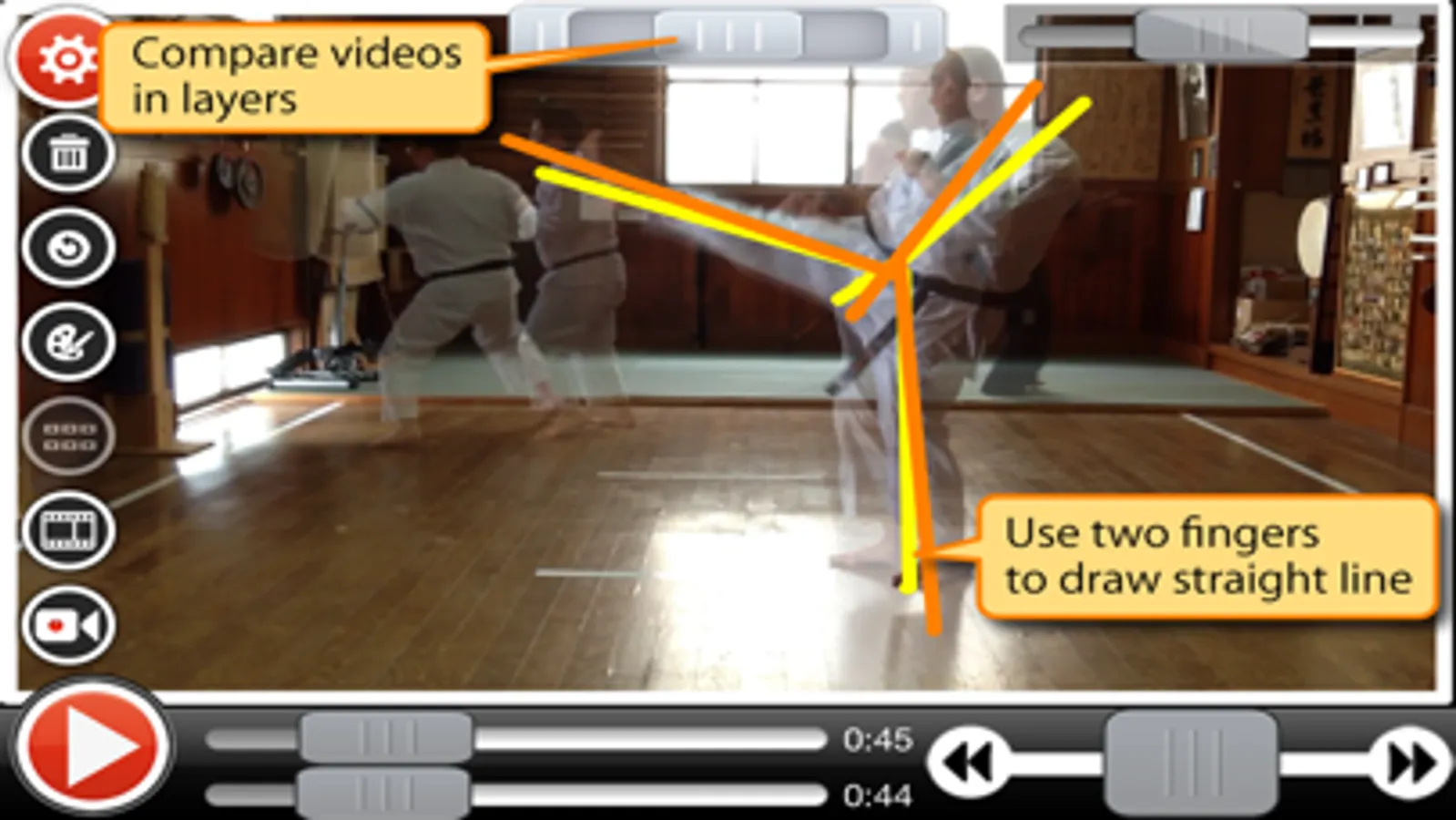 The markings can be drawn on the screen while the video plays in slow motion, or while playing step by step. This option can be used to easily point out ideal forms or movement. You can draw straight lines using two fingers in order to find out the axis of your body movement.