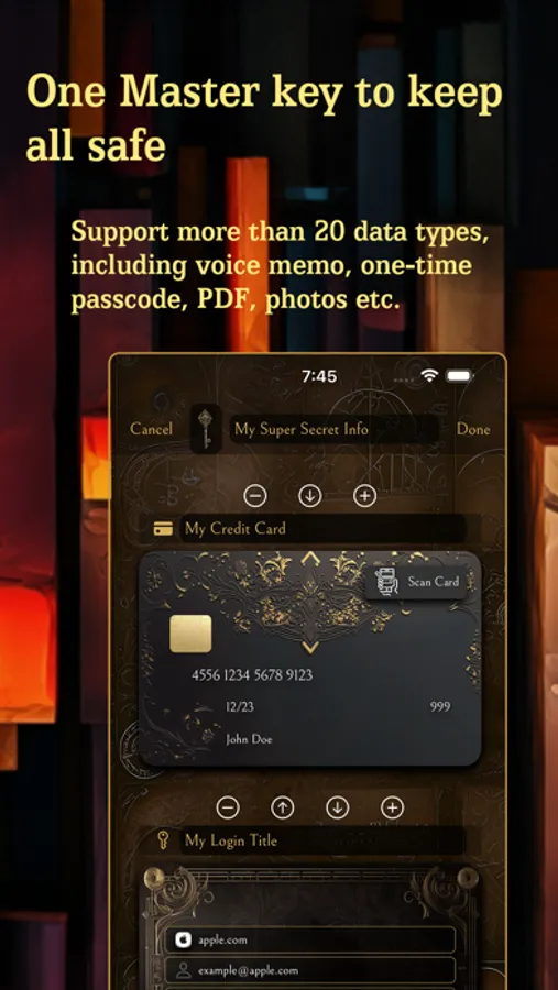 ◯Credit Card Scanner: Effortlessly scan and record your credit cards for easy and secure access.