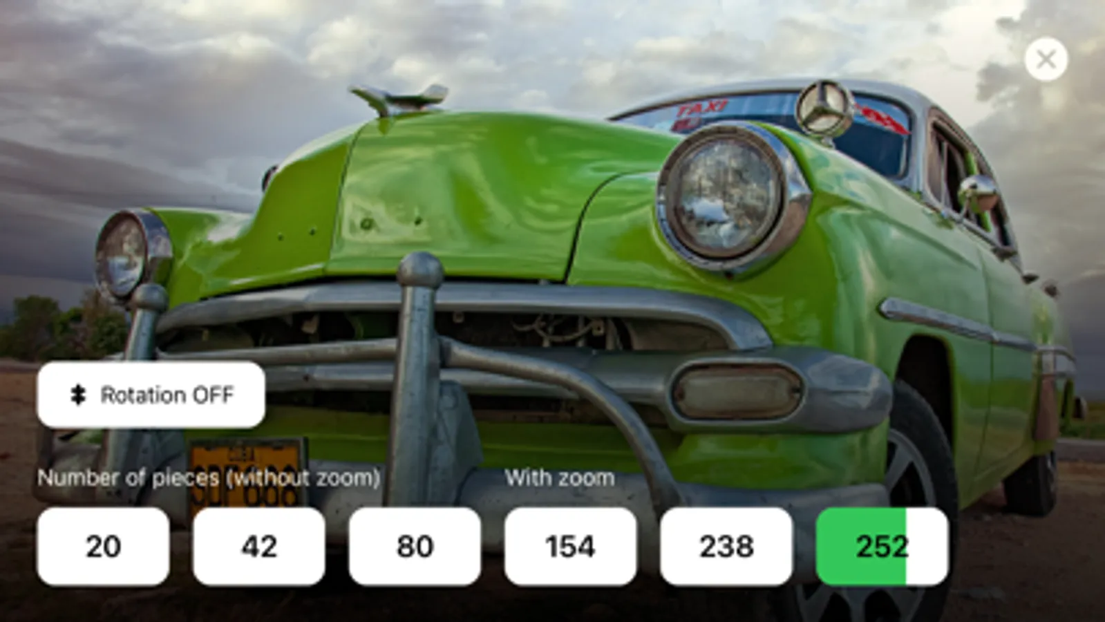 - 8 levels of complexity: from  20 pieces up to 1110 pieces, available for any puzzle;