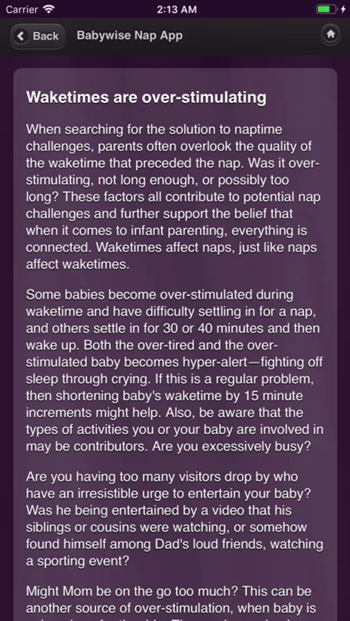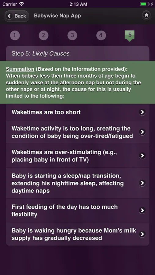 Your baby has always been a good sleeper, especially at naptime, but now is suddenly waking halfway through his the nap with a forceful cry. The cry is not the problem but it signals a problem that must be discovered. The Babywise Nap App is an analysis tool that can help any parent isolate the underlying cause of nap disruptions and sleep disturbances for infants between 2 to 12 months of age. By working through a few basic questions, the App reduces the hundreds of nap disturbance variables down to the most likely causes for a baby's sleep disturbance. Once the list is generated, the app offers the most appropriate solution based on the analysis from the data provided.