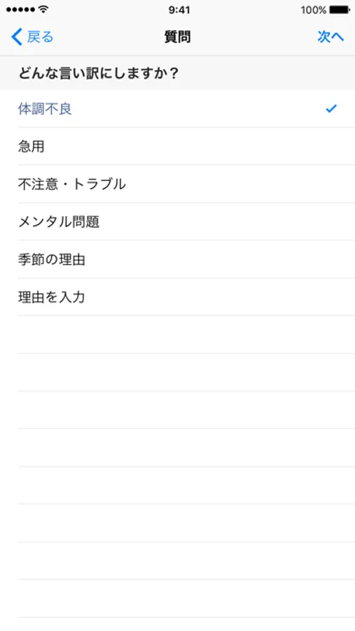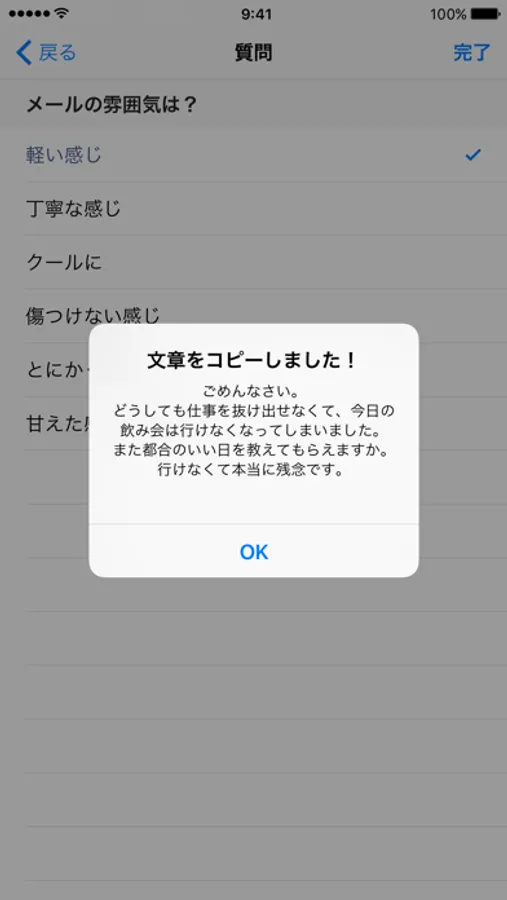 ドタキャンする理由、次回の予定、雰囲気などを選ぶだけで、誠意のある文章が簡単に作れる便利なアプリです。