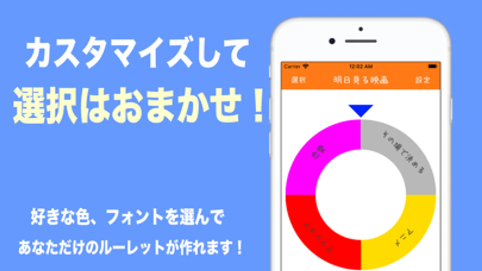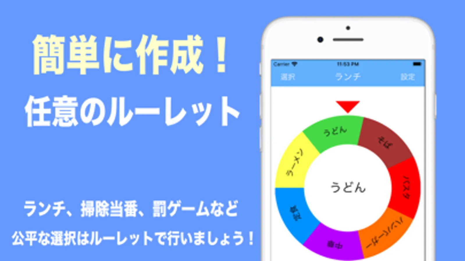 今日のランチ、休日にする事の優先度、観光地めぐりのルート、掃除当番、罰ゲームなどちょっとした選択を公平に行うためのルーレットです。