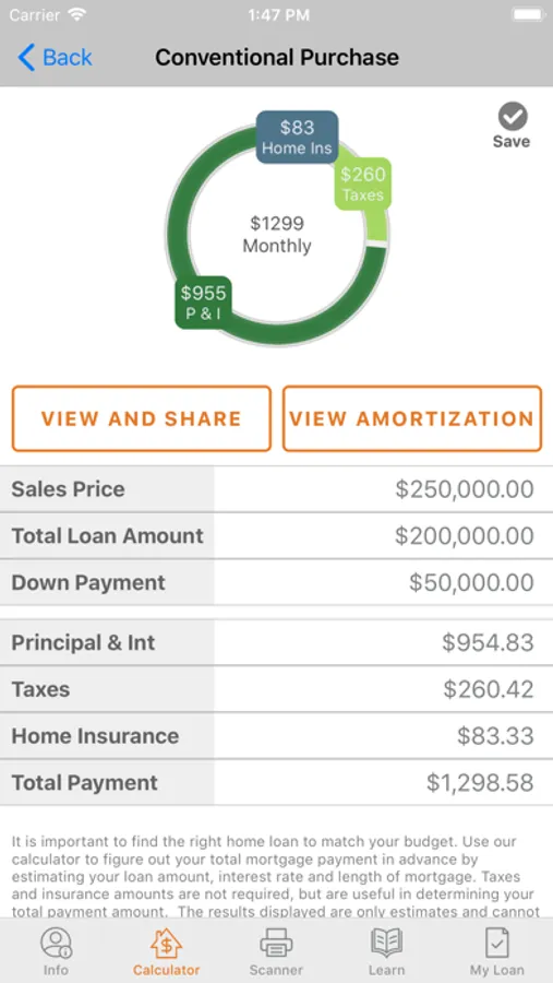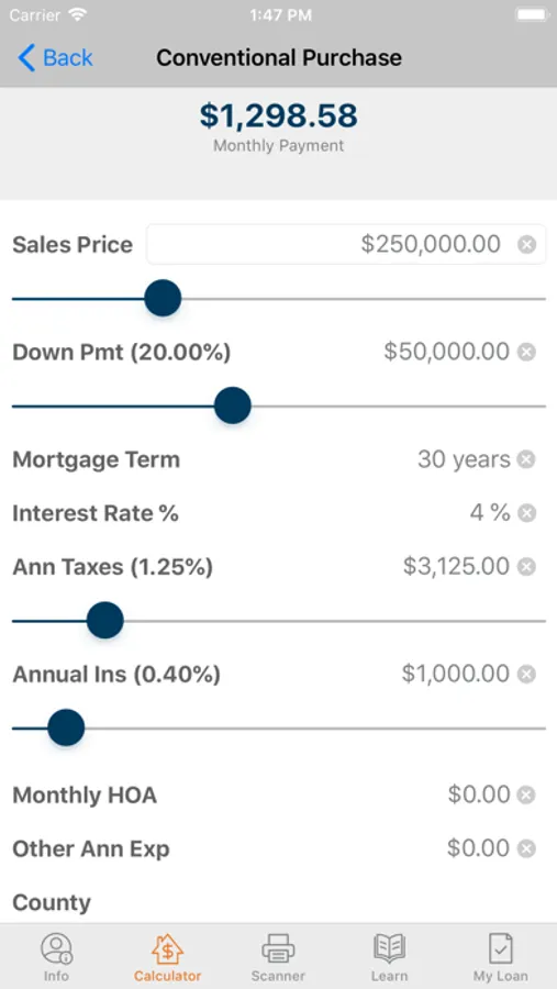 The calculator is quick and easy to use. Use the app to calculate New Home or Refinance FHA, Conventional, Jumbo, Rural, and VA loans. Affordability calculations can be done to determine what size of loan works for you. Enter a few parameters such as the sales price, insurance and tax amounts, and SimpleNexus will calculate your monthly payments. It handles all the details of calculating necessary MI and required down payment amounts by understanding the loan type you are looking to perform. When you are done with your mortgage loan calculation, save the quote for later or contact a qualified mortgage broker right from inside the app! SimpleNexus Mortgage Calculator Features: