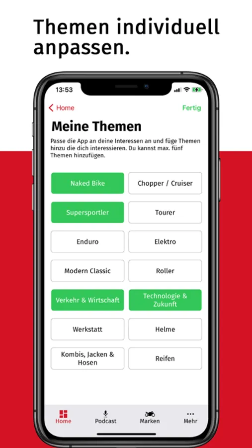 Zentrales Element der MOTORRAD-App ist die neue Funktion „Meine Themen“. Hier könnt ihr eure persönlichen Interessenfelder individuell zusammenstellen und erhaltet so immer die neuesten Nachrichten passend zu euren bevorzugten Themen.