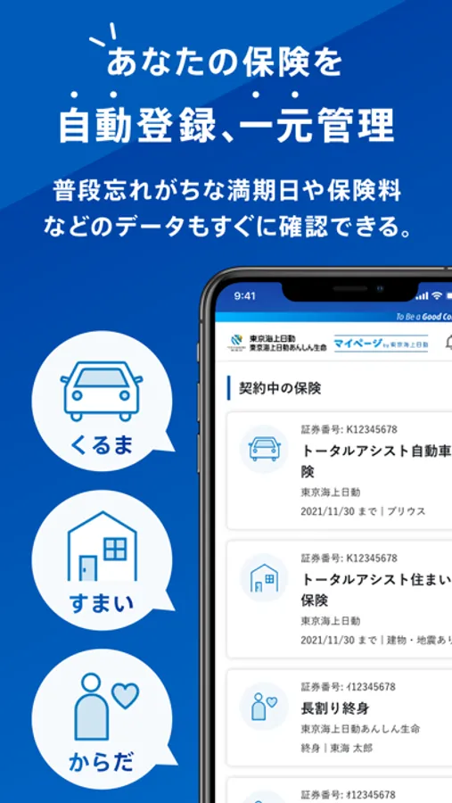 東京海上日動・東京海上日動あんしん生命がご提供するスマホアプリ「東京海上日動マイページ」です。