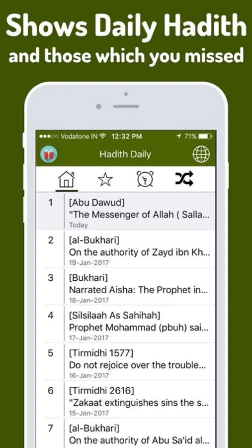 You can view Random Hadith's and share the hadith with others using Facebook, Email or SMS. You can add the hadiths to the Favorites section. You can also Set-up Reminders to get notification of hadith at any time of the day!