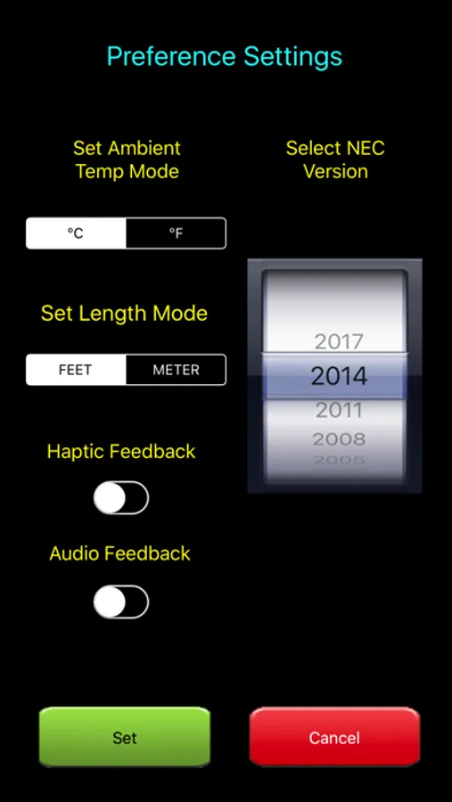 Electrical Calc Elite™ is compliant with 2017, 2014, 2011, 2008, 2005, 2002, and 1999 NEC®. NEC 2020 available as an in-app purchase.