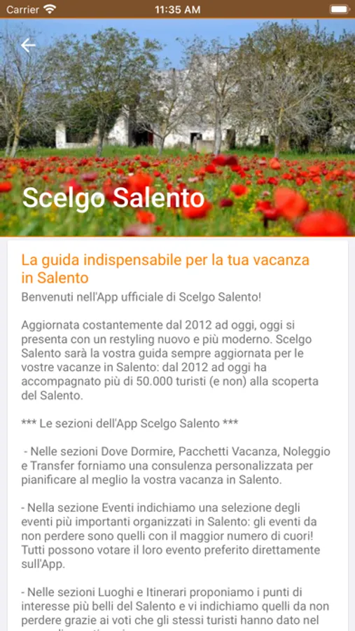 Scelgo Salento App propone centinaia di schede informative contenenti tutta l’offerta turistica del Salento, con descrizioni, foto, geolocalizzazione, curiosità e consigli. Ogni scheda può essere aggiunta al vostro itinerario personalizzato cliccando sul cuore e per ogni scheda è indicato quanti utenti hanno scelto quel luogo o quell’attività pianificando la loro vacanza in Salento.