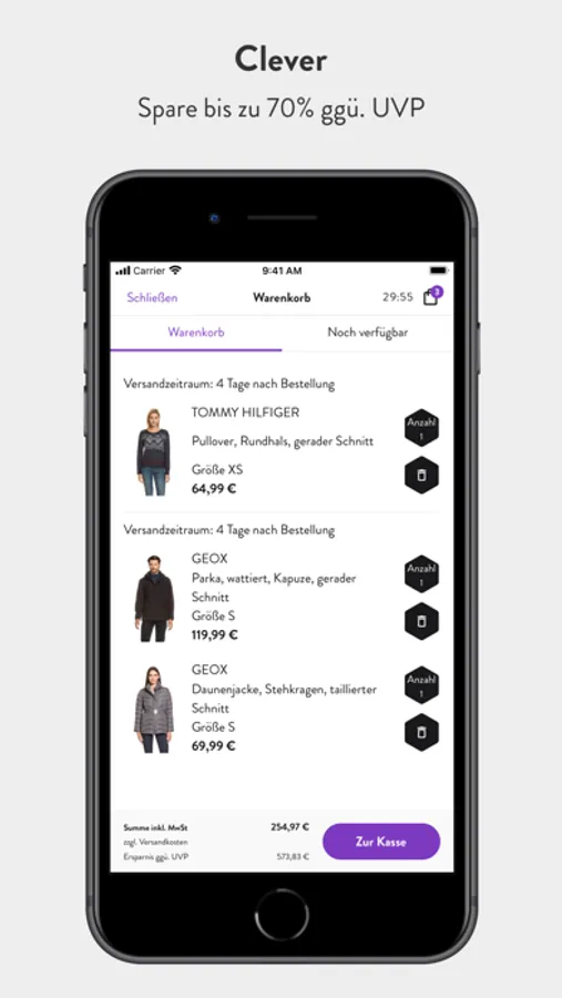 - Smarter Warenkorb: Artikel in deinem Warenkorb sind automatisch 30 Minuten für dich reserviert. Aber auch nach Ablauf dieser Zeit bleiben sie unter dem Tab „Noch verfügbar“ für dich gespeichert. Ist der Artikel bereits im Warenkorb anderer, informiert dich eine praktische Wiederverfügbarkeits-Benachrichtigung, sobald er wieder erhältlich ist.