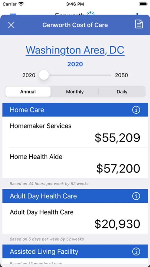 The Genworth Cost of Care App provides a convenient way to view long term care cost details in today’s dollars across various care settings and estimate future long term care costs. Since 2004, Genworth has conducted long term care cost surveys across the U.S., with an aim to helping families evaluate options to address the increasing cost of long term care. The Genworth Cost of Care Survey 2021, documents the costs for long term care received in-home, through adult day health care services, care provided in an assisted living facility or at a nursing home.