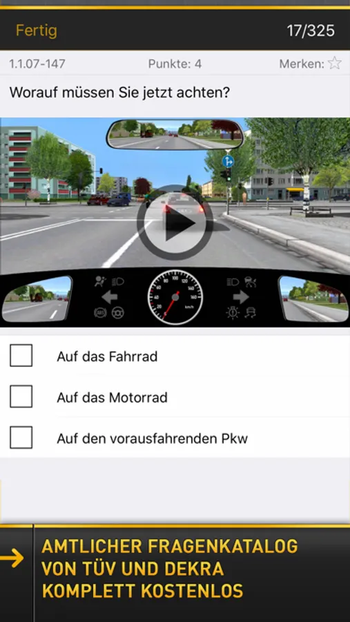 Enthält die Original-Fragen aller Klassen von TÜV und DEKRA mit allen Original-Videos!