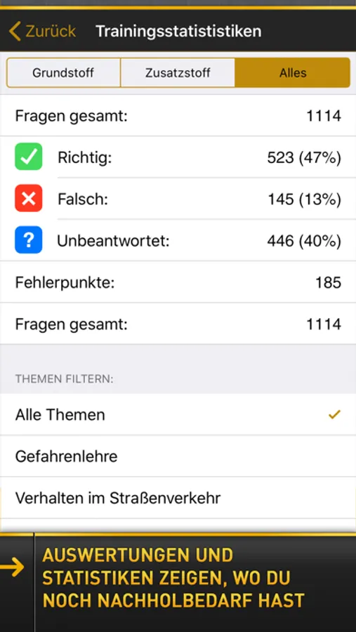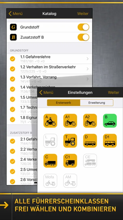 Lerne alle Original-Fragen kostenlos und ohne Einschränkungen. Nur wenn du zum Schluss nach den amtlichen Regeln die Prüfung simulieren möchtest, schaltest du diese Funktion innerhalb der App für einmalig 4,49 € frei. Dadurch werden auch die Werbung deaktiviert sowie der Zusatzstoff für die Spezialklassen L, T, D, D1, C, C1 und CE freigeschaltet.