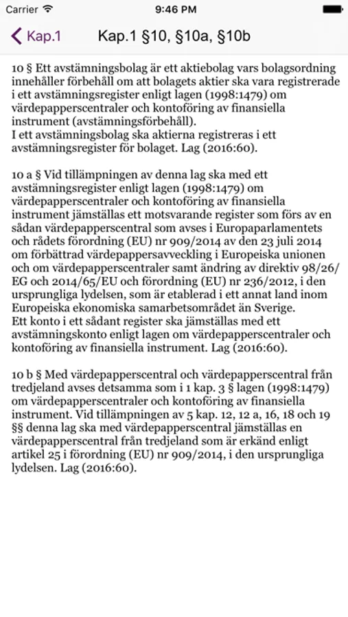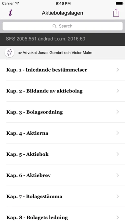 Appen ger omedelbar och överskådlig tillgång till den svenska aktiebolagslagen, sorterad på kapitel och paragraf.