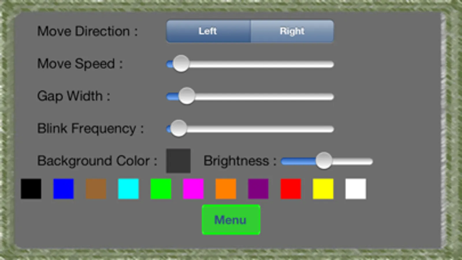 * You could set LED's color, canvas length, move direction, move speed, gap width, blink frequency and background color of your own.
