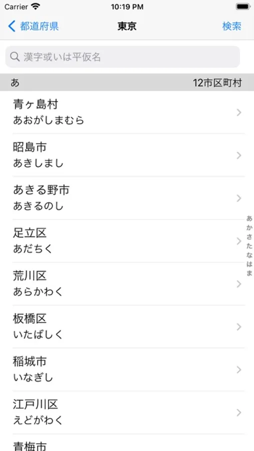 全国の市区町村(ひらがな)、町(ひらがな)と郵便番号の検索機能。