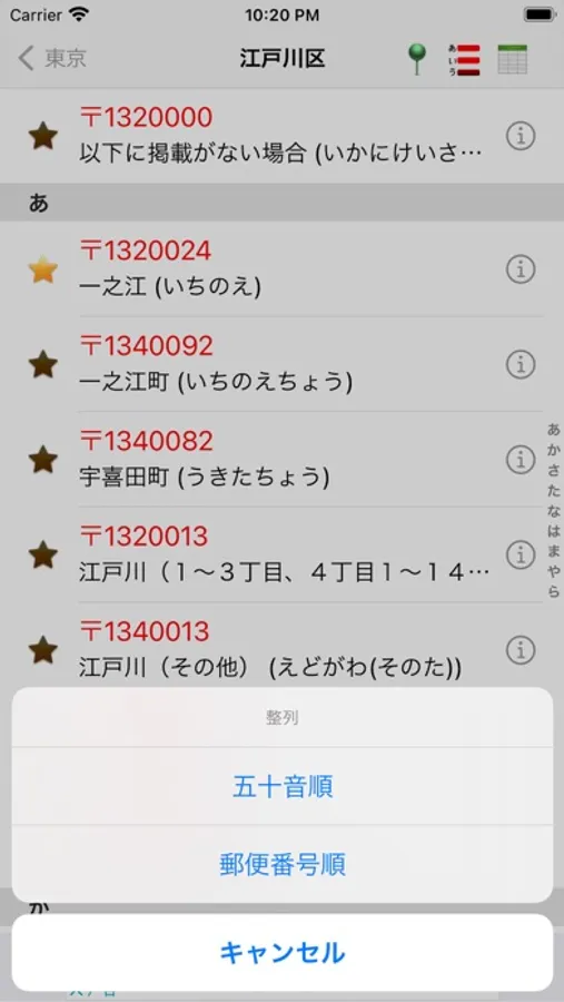 「五十音順」と「郵便番号順」で整列できます。「五十音順」の場合、地区より検索、参照しやすいです。「郵便番号」で整列なら、地図との連携を通じて、各地-