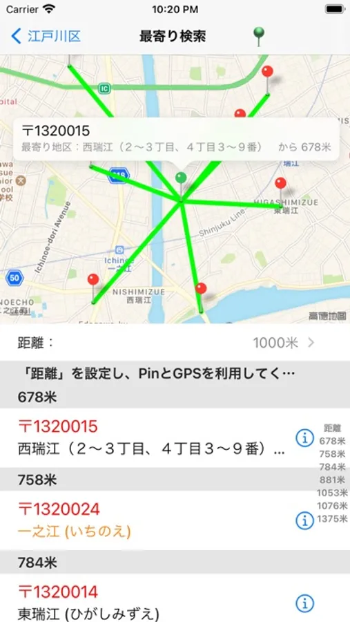 指定地点(マップ中心或はGPSで指定)の指定距離以内のすべての郵便番号が検索できます。(検索結果と気に入りの情報も検索可能!)