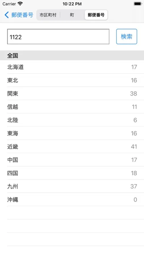 県内の市区町村(ひらがな)、町(ひらがな)と郵便番号の検索機能。