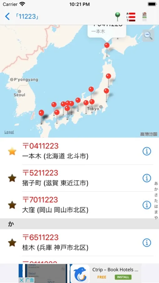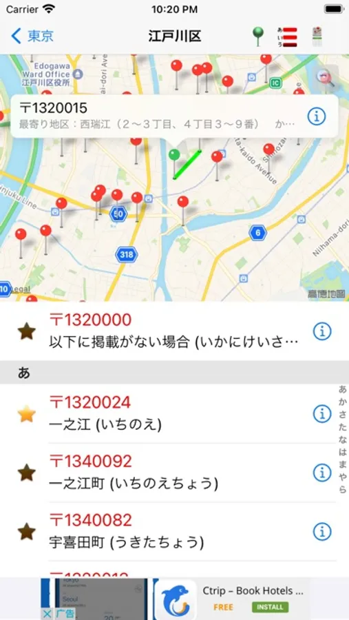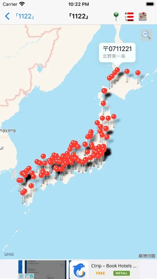 地図より、指定地点(マップ中心或はGPSで指定)郵便番号(最寄り郵便番号)の検索ができます。(検索結果と気に入りの情報も検索可能!)