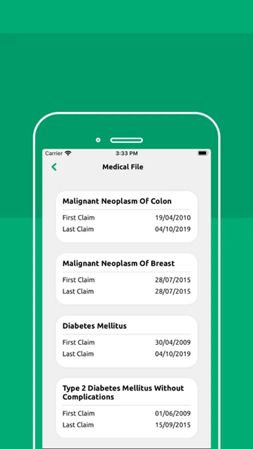 - Medical File: The member can securely view his medical file and medical history by Diagnosis, 1st & last episode