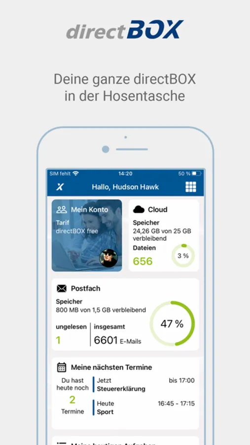 Grab your personal directBOX now. Simply register online and enter your directBOX credentials in this app to access all your data.