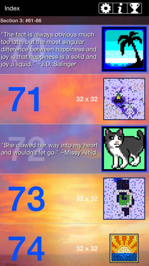 Finish solving to see the miniature picture that you have created. As an extra reward you get a quote related in some way to the picture. Witty or wise, it will give you a little something to think about as you go on to the next puzzle.