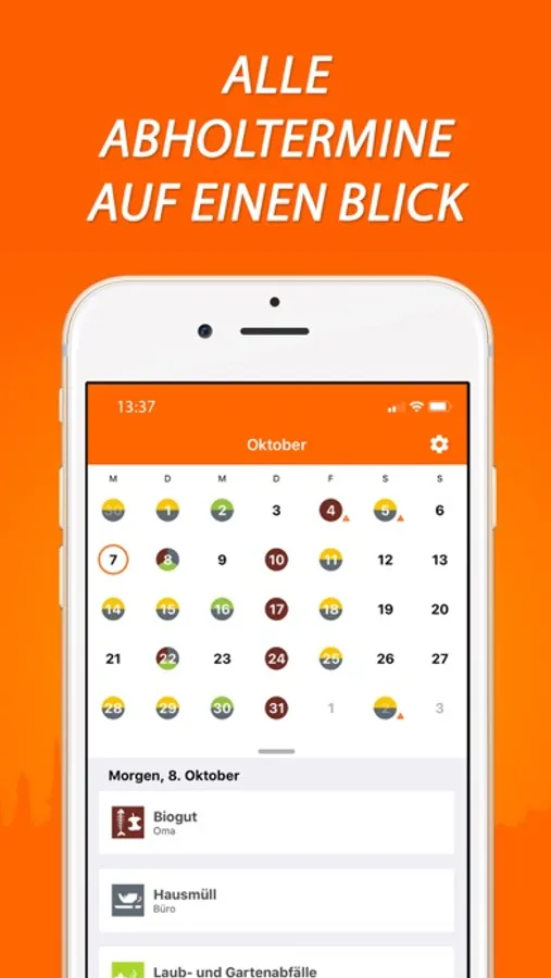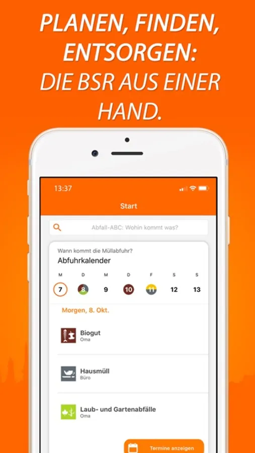 - Verpasse keine Abholung mehr: Ermittle die Termine für die Abfuhr deiner Tonnen für Hausmüll, Biogut und Wertstoffe im Abfuhrkalender und lege dir für Glas und Papier eigene Termine an.