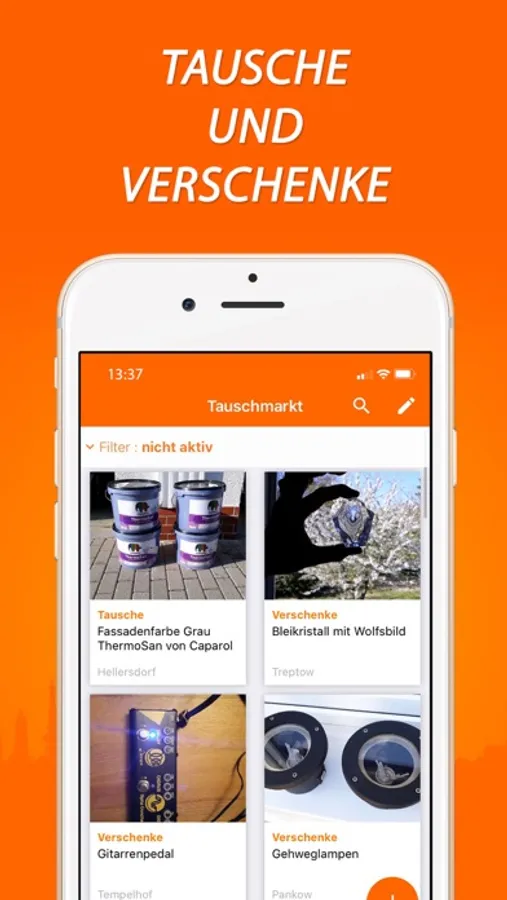 - "Das ist doch noch gut..." - Zu schade zum Wegwerfen? Mit dem „Tausch- und Verschenkmarkt“ kannst du kostenlos abzugebende oder gesuchte Gegenstände inserieren oder auch verschiedene Sachen gegeneinander tauschen – und das mit Foto und bequem von unterwegs.