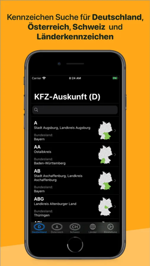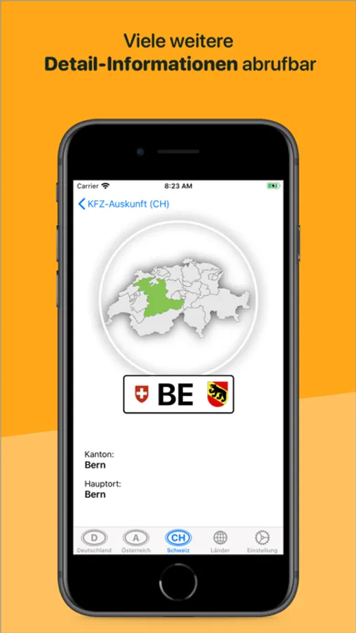 Neben den KFZ-Kennzeichen für Deutschland können auch Kennzeichen für die Schweiz abgerufen werden.
