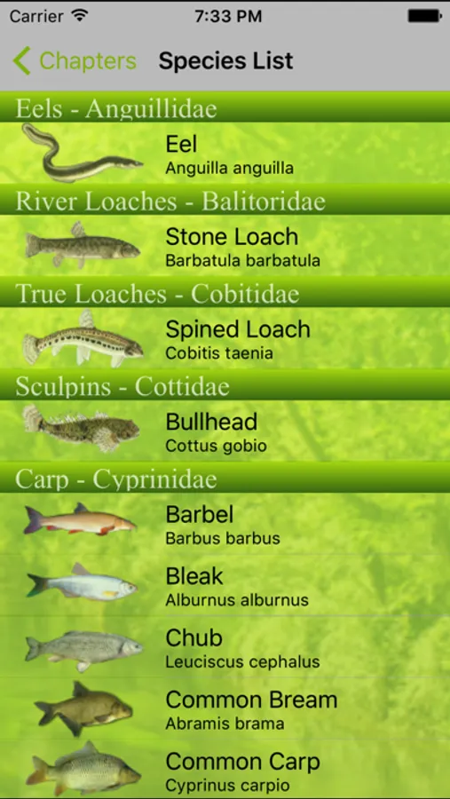 The fish database includes most native species that can be caught in the British Isles. This database includes multiple images and comprehensive descriptions including colouration, size, growth rates and spawning habits. Knowledge of best methods including tackle, and feeding habits are also included in the description. The species range within the UK is often discussed.