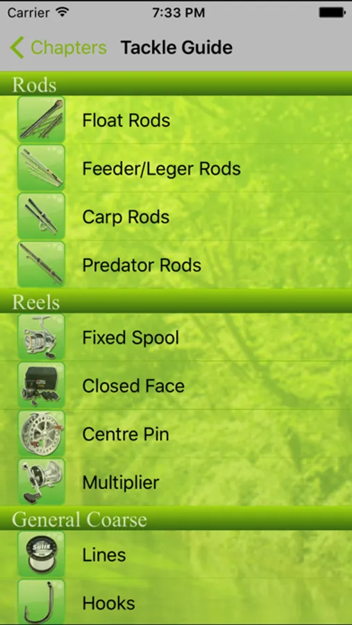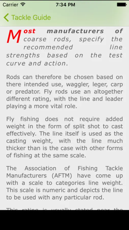 The tackle guide describes the various rods used by anglers in great detail, with sections given over to float, ledger, feeder and fly fishing. The application also discusses the rods test curve, the different rod guides including construction materials, and the types of rod joint used today. The reel section describes the different types of reel available today, including centre pins and fixed spool, to multipliers. Pros and cons of each are discussed and to which are more suitable for the type of fishing required. Lines, hooks, nets floats, flies and other essential pieces of kit are all discussed.