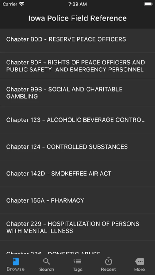 Iowa Police Field Reference is an application for police officers, deputies, attorneys, criminal justice students, and other law enforcement professionals in the state of Iowa. It features a browseable, searchable database of the entire Iowa Criminal Code, Iowa Traffic Law, and other selected chapters that are useful in the daily duties of a law enforcement officer as well as a variety of additional reference material.