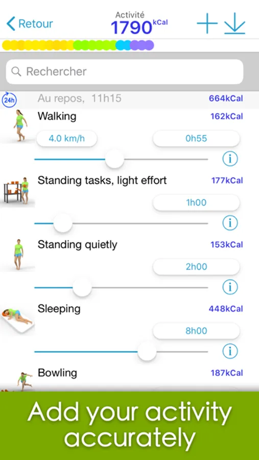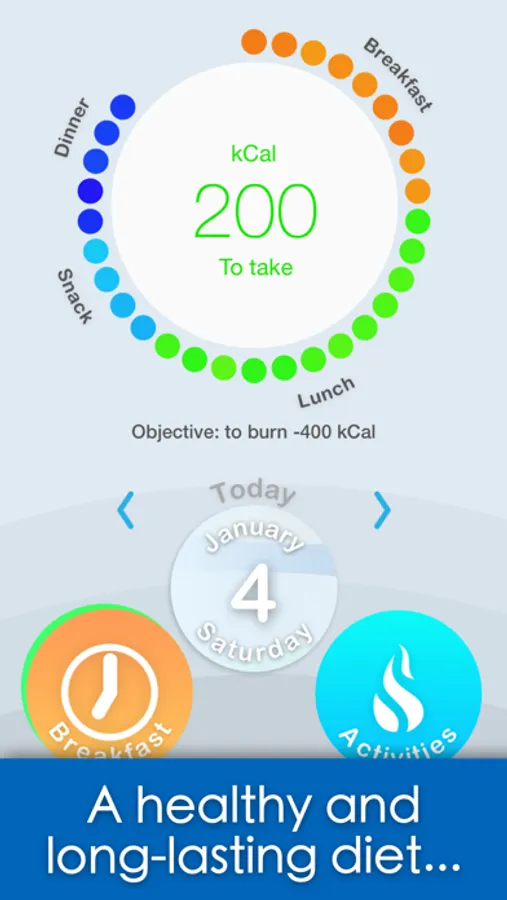 Quickly count your calories, and deduct your energy expenditures (activities) to find out how much calories you have stored or burned today. Numerous graphs provide you with a complete analysis of your diet: