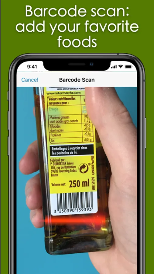 • Barcode scan: quickly add new foods from packaging (uses “OpenFoodFacts”, an open and collaborative database),