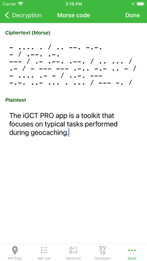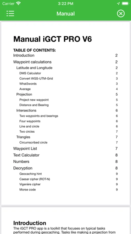 The iGCT PRO app is a toolkit that focuses on typical tasks performed during geocaching. Tasks like making a projection from a waypoint, determining a new waypoint using two other waypoints, determining the distance to these waypoints, calculating the value of a Roman numeral, and averaging waypoints are examples of what the toolkit can accomplish.