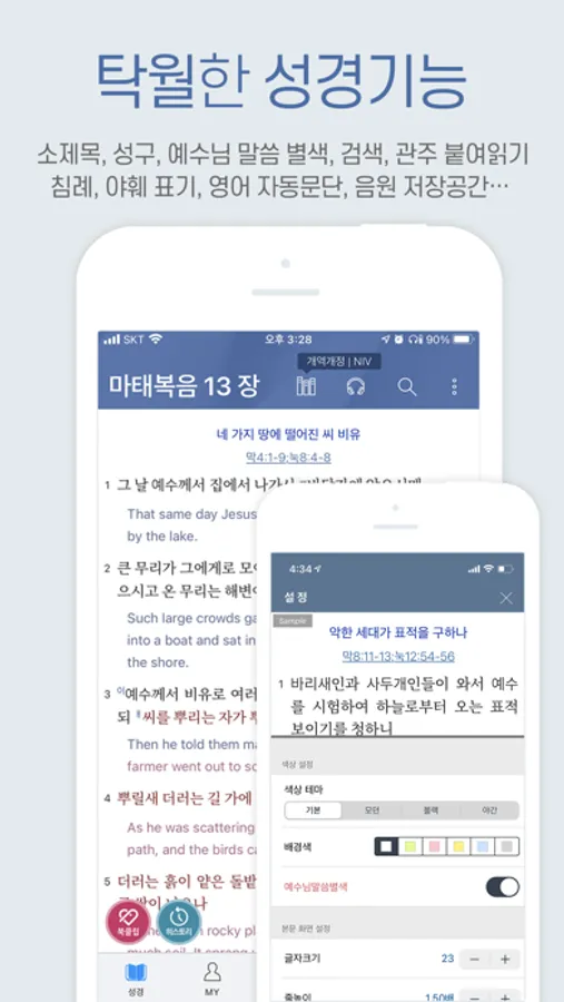- 소제목, 예수님 말씀 별색, 붙여읽기, 침례, 야훼 표기, 글짜크기, 폰트 굵기, 자간, 야간모드, 성경음원 자동삭제 등