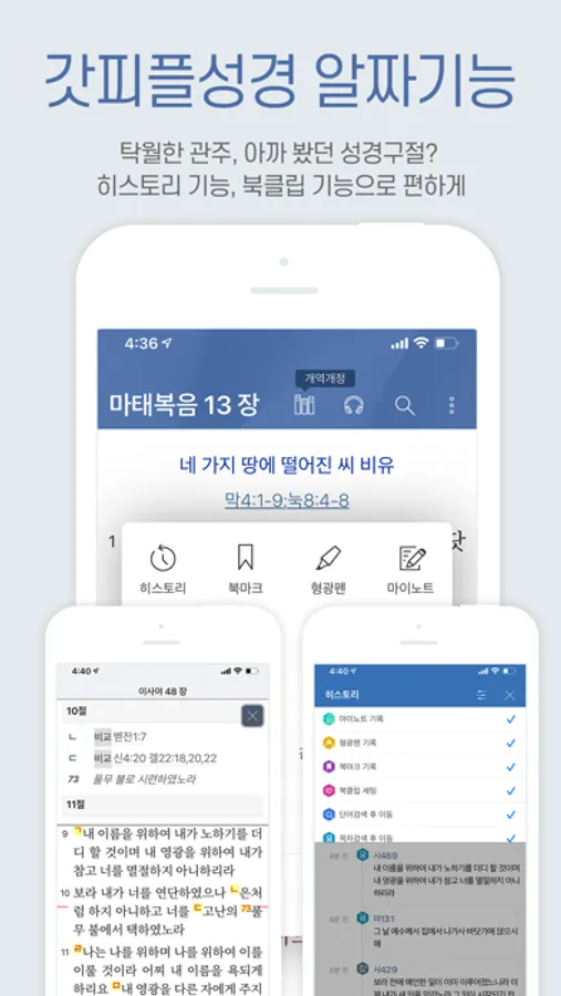 – 정말 보기 편한 관주, 히스토리, 북클립, 쉽고 빠른 성경찾기, 가로모드 보기, 특별한 성경검색