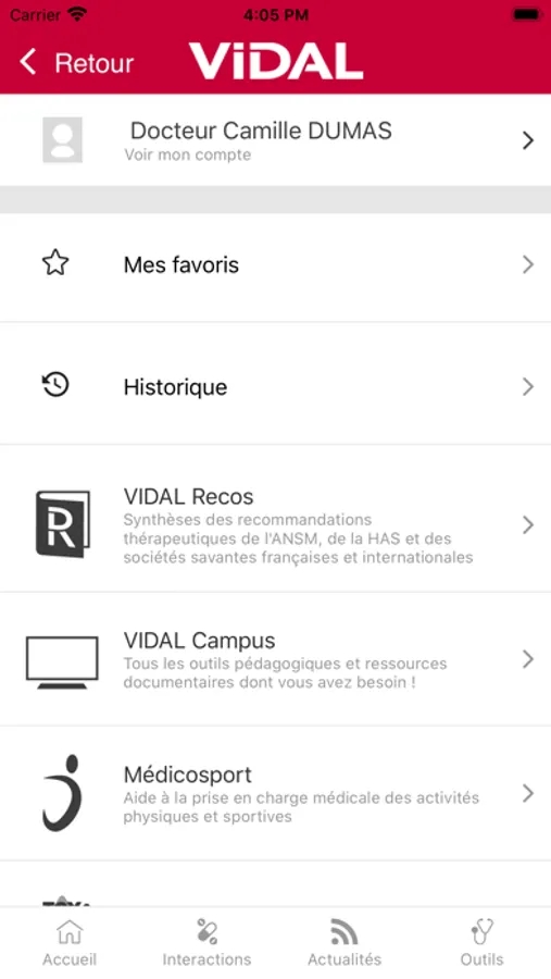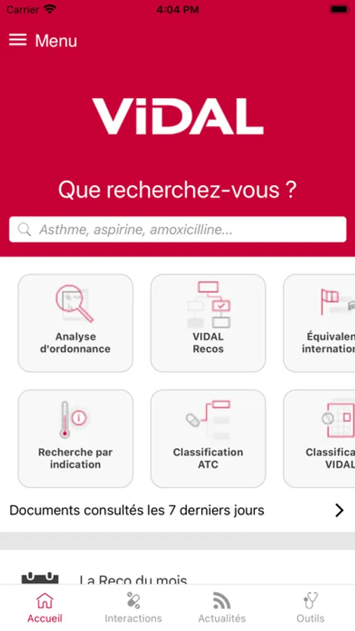 Un abonnement de 12 mois est requis pour consulter les Monographies et fiches DCI (29,99€) et les VIDAL Recos (19,99€) et bénéficier de leurs mises à jour mensuelles. Hors abonnement, seules les listes de résultats sont accessibles. Abonnez-vous directement depuis l’application :