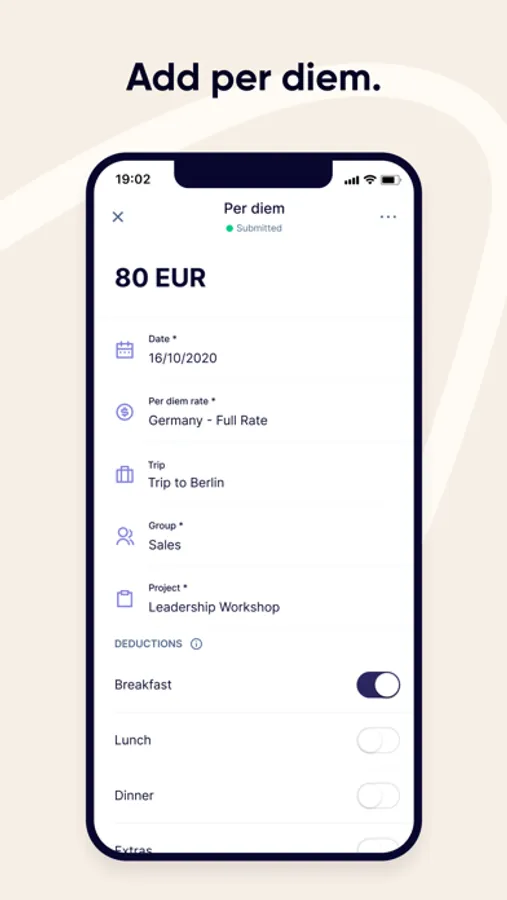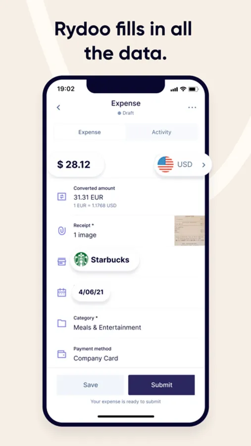 • Save time filling in your expenses. Our system will read and extract data automatically from the receipt.