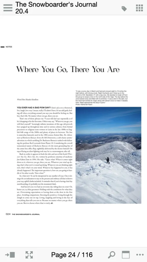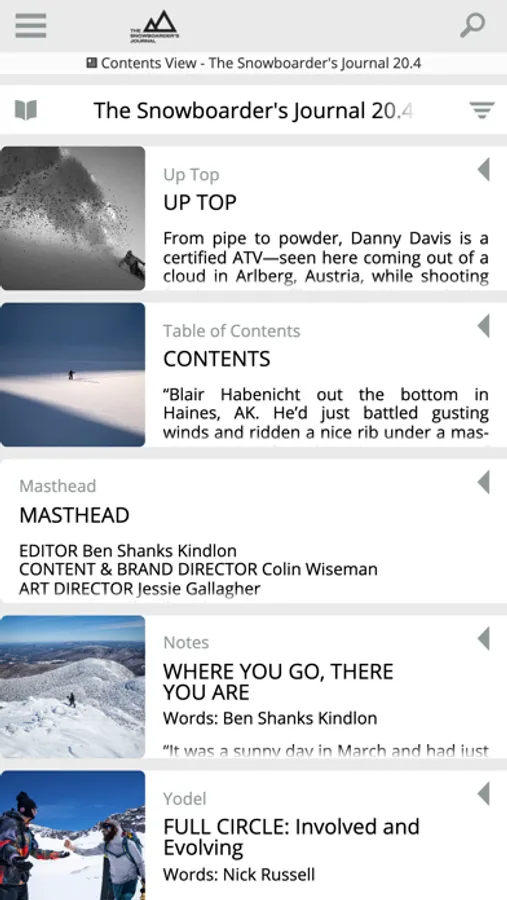 The Snowboarder’s Journal is snowboarding’s true voice. Featuring interviews and adventures with top riders and underground legends who define snowboard culture and explore the planet’s mountainscapes, The Snowboarder's Journal includes breathtaking image galleries, video and words from the best writers, photographers and artists in the snowboard world.
