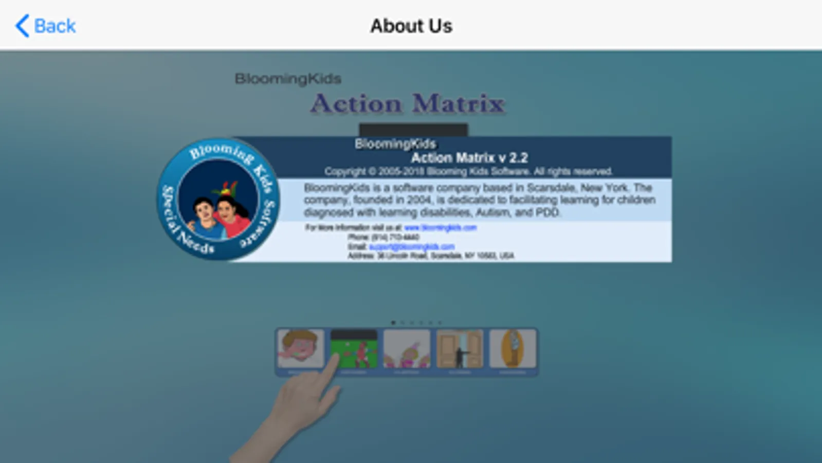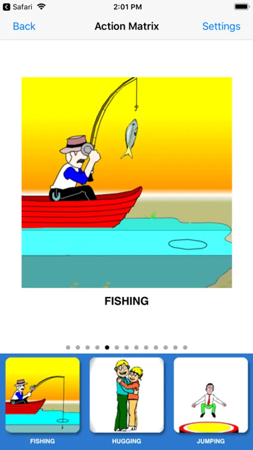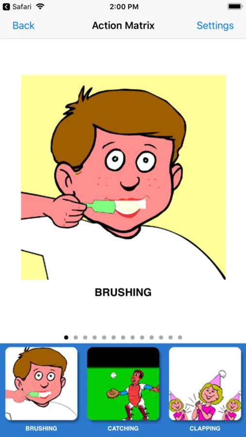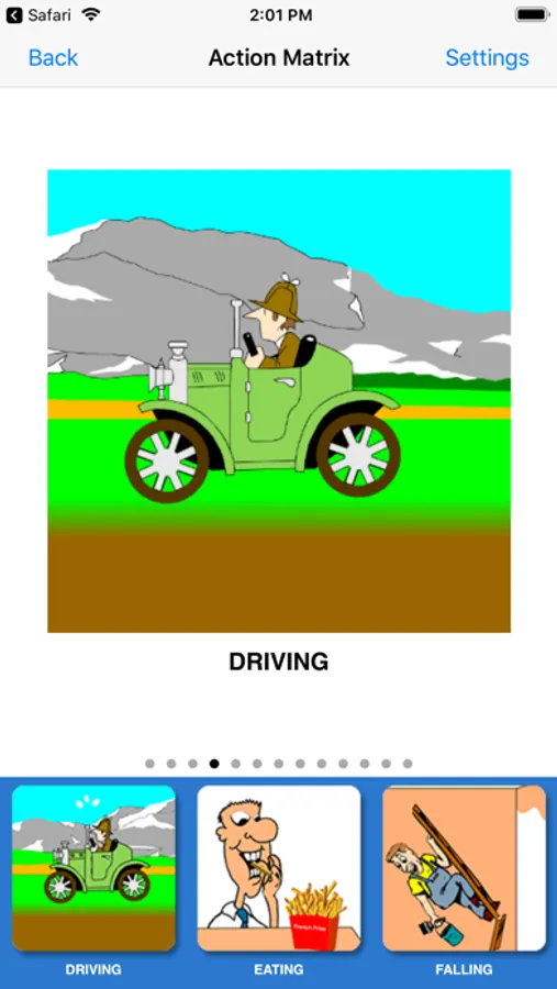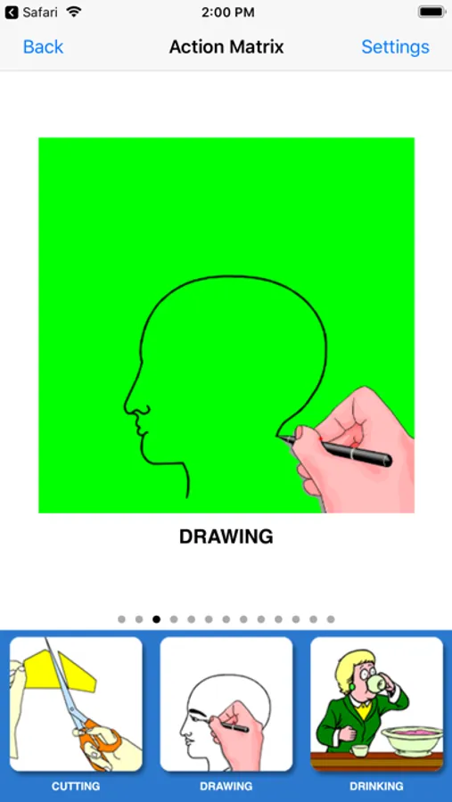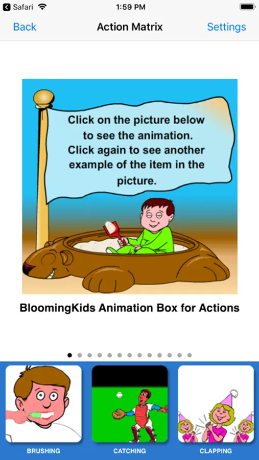 Actions are shown here in a two-row, two-column matrix. When the mouse pointer moves over the picture of an action, an animation related to the action plays in the box on the right side of the screen. There are, in this program, two pictures and animations for each action. Click on the picture to view the next picture and animation.