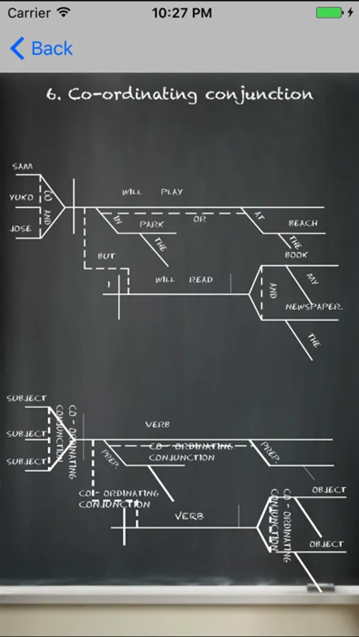The style of diagram adopted in this app is known as the 'Reed Kellogg' style, and there are many websites and books devoted to it. In our view this style of diagramming offers one of the more enjoyable ways to test and improve your knowledge of grammar, especially if you have a visual mind.