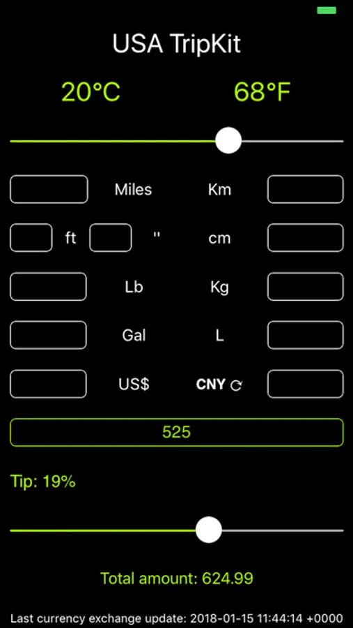 USA TripKit does not intend to be a comprehensive unit or currency converter. Just DOES THE NECESSARY conversions that you will need during your trip or your first months abroad.