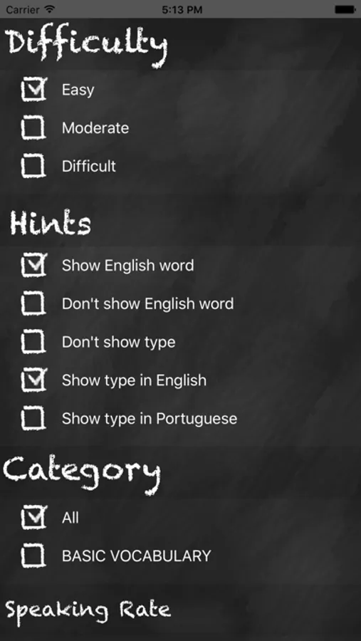 The game play is highly configurable, with 3 difficulty settings, and optional hints including the corresponding English word, and type of word (lexical category) in English or Portuguese.