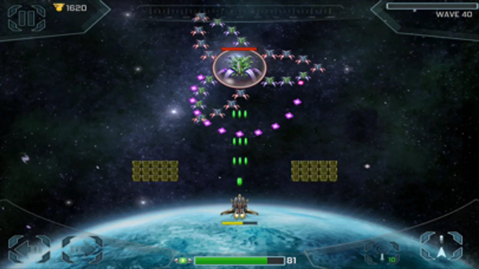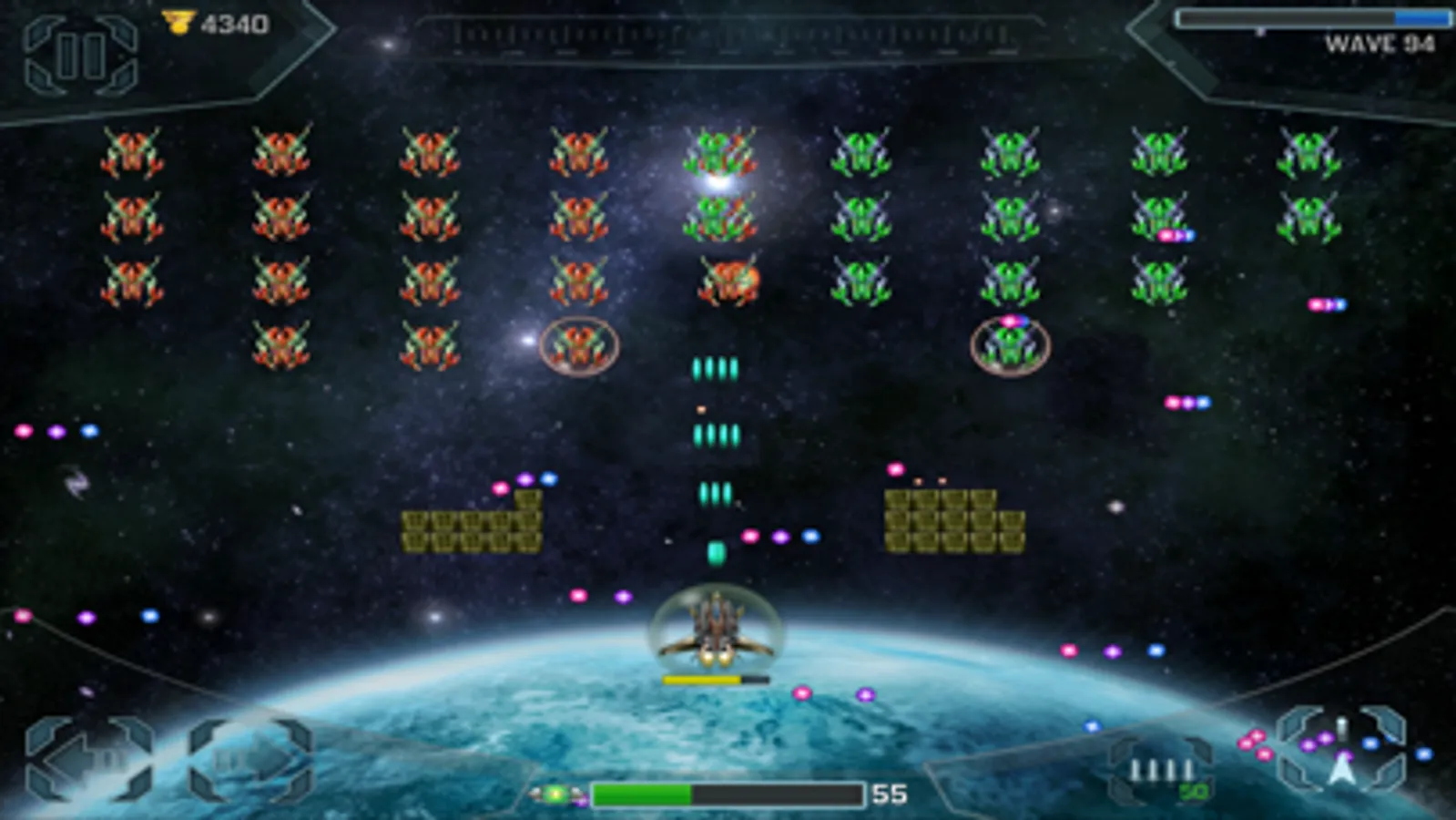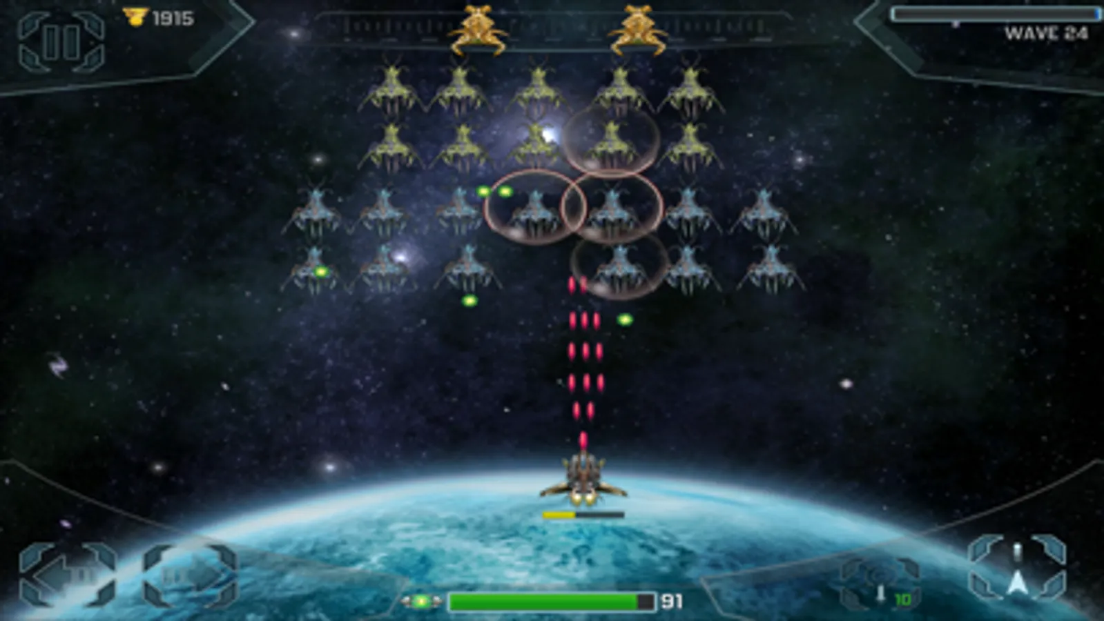 These are troubling times. Earth’s very existence is threatened. Alien invaders from space have been sent to destroy our planet. You have been called up to repel their attack. You must plan your battle strategy well and upgrade your fighter ship to defeat the increasingly advanced aliens. Beware, their powerful overlords are watching and will join the fight to help the alien forces destroy us. We’re counting on you. Earth is counting on you. Suit up Space Cadet!