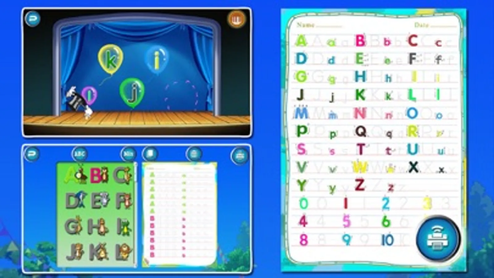 ** 9 Games play, tap, trace, match and print with A-Z, a-z and 0-10.