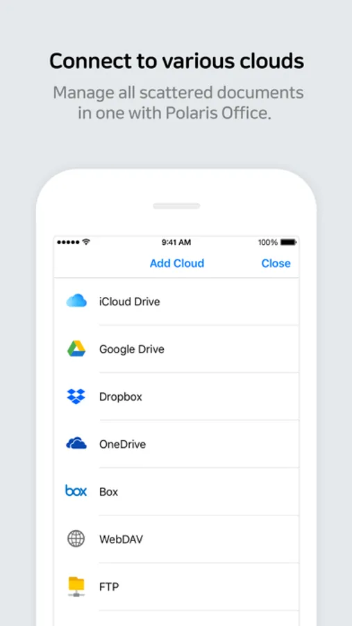 Support a variety of cloud services (iCloud, Google Drive, Dropbox, OneDrive, Box, WebDAV, FTP etc)