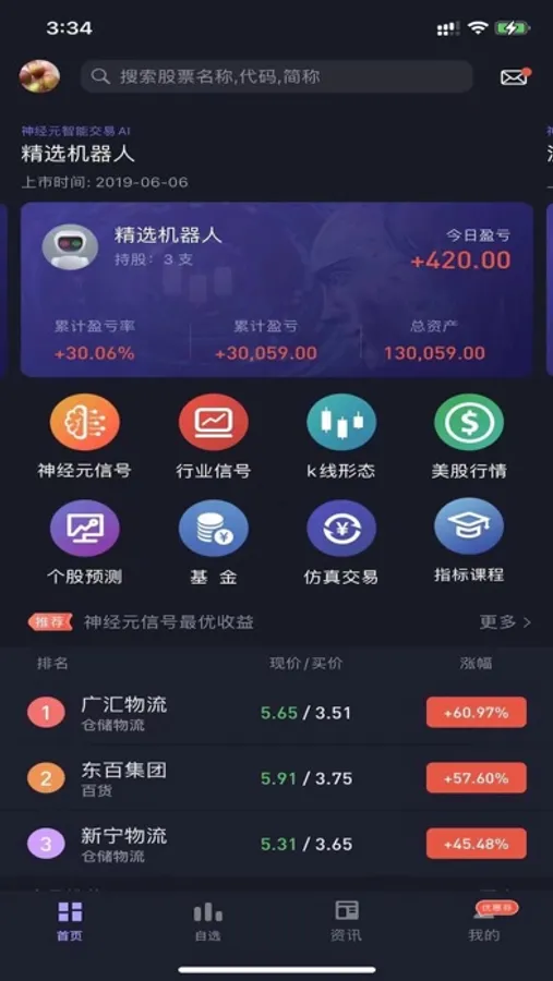 《玩股成金》是一款主打智能选股和炒股入门股票学习训练的股票教育类金融财经软件。